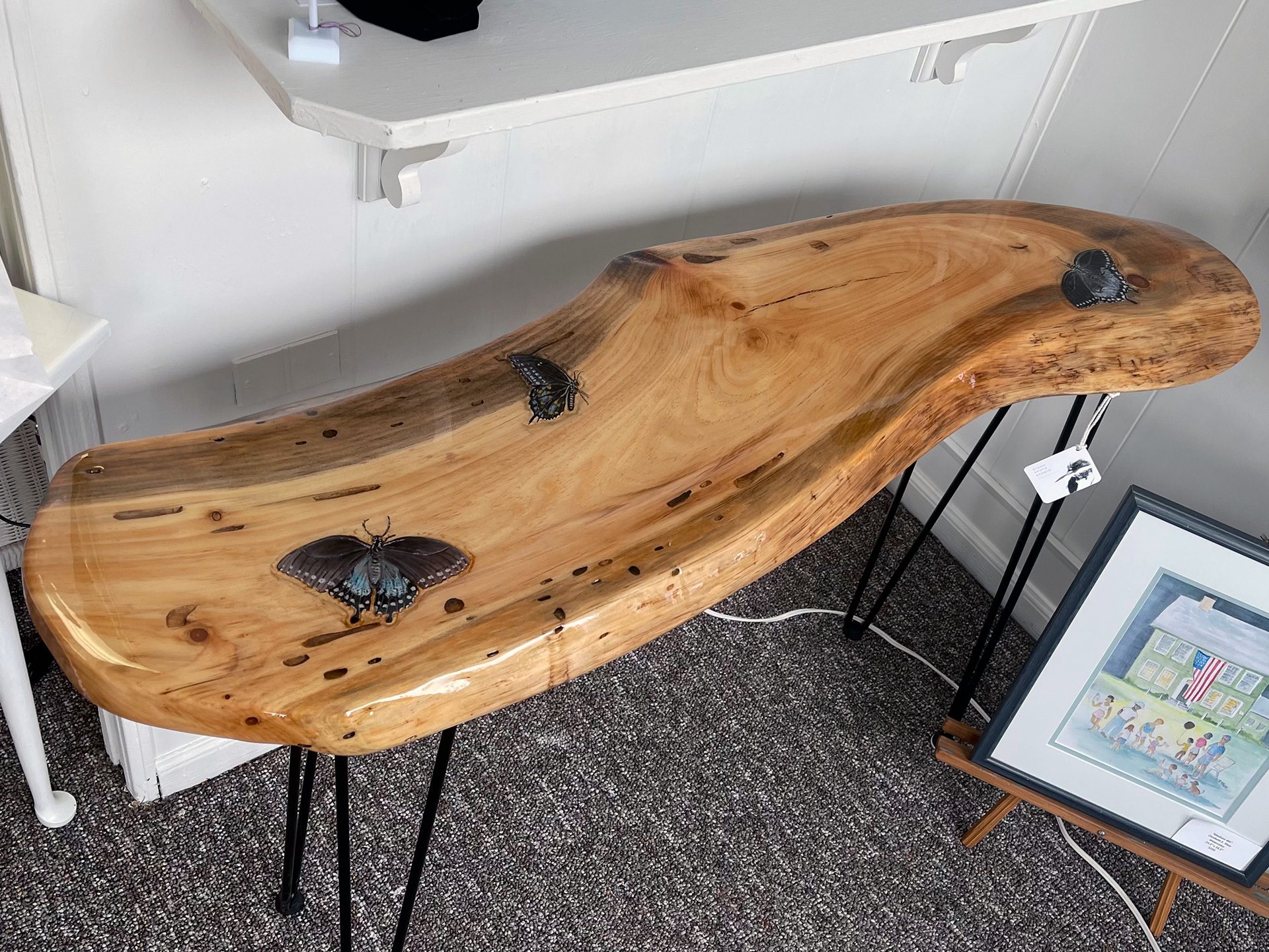“Butterfly” Acrylic Spicebush Swallowtail Butterflies,Carved Knotty Pine, Epoxy Resin Table 48″ x 13″ x 30″ Available at Clinton Art Gallery, […]