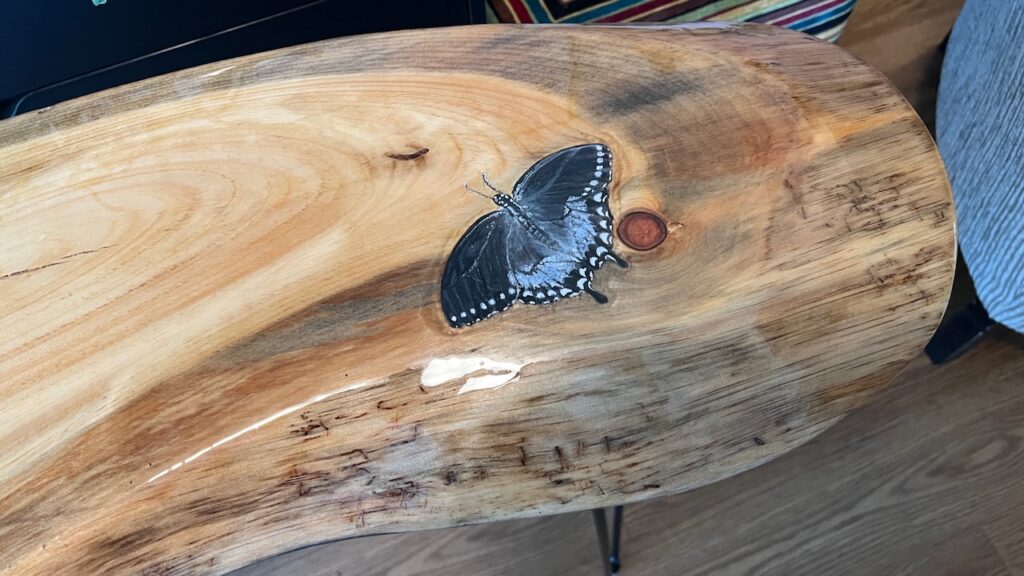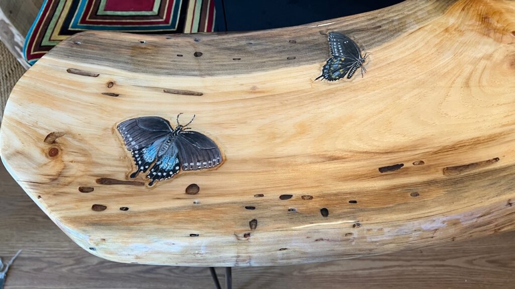 Acrylic Spicebush Swallowtail Butterflies,Carved Knotty Pine, Epoxy Resin Table